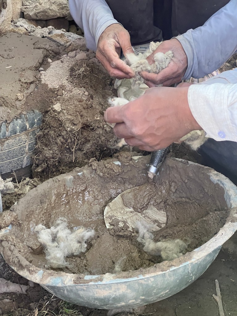 Being next to a river, the soil is sandy-silty. Soil with higher clay content from different locations in Ladakh are used plasters, the top soil from agricultural land is used to making adobe blocks used in constructing load-bearing walls.